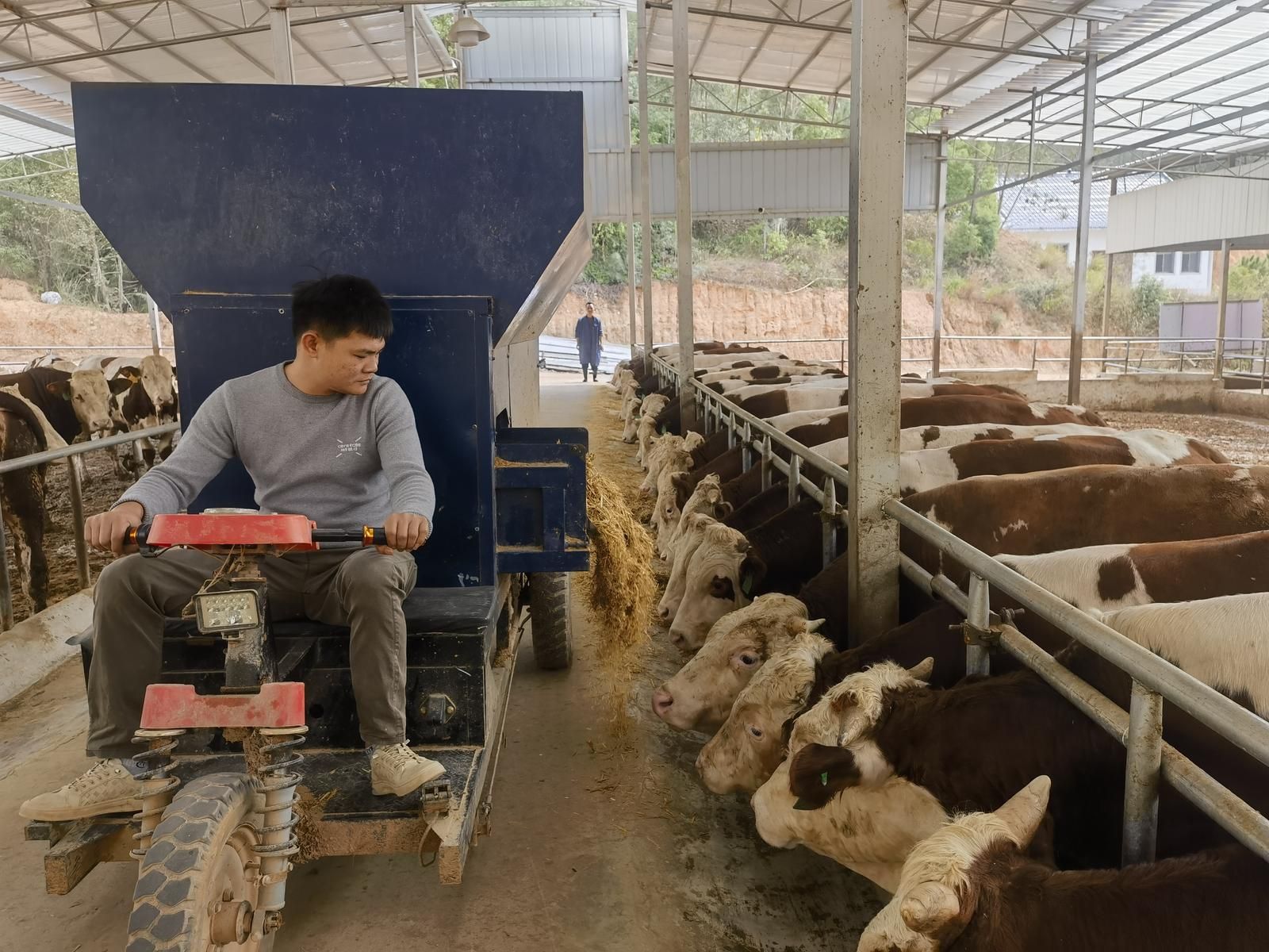 “哞哞……”叫声起处,一排排整齐的牛舍映入眼帘,体格健壮的牛儿正悠闲啃食草料。不远处,粪便生态处理区有序运转。“牛粪尿先干湿分离,渣子发酵晒干,卖给种植户当肥料;液体经发酵池曝氧净化,流入池塘养鱼,池塘水再浇灌周边牧草,真正实现‘零排放’。”工作人员告诉记者。