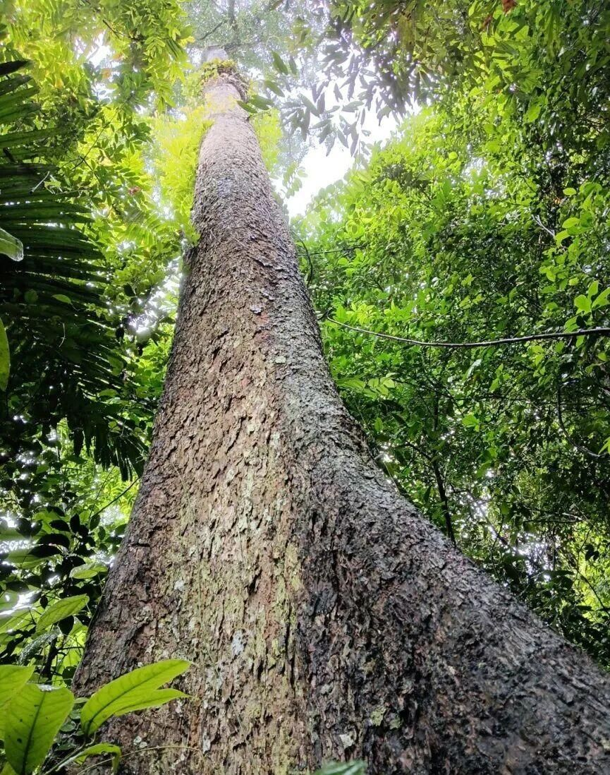经过一个多小时的翻山越岭,我们总算来到了一棵高大的树下,虽然已经很累了,但是能见到云南蓝果树的神奇,让我们迫不及待地想目睹这个国家一级保护植物的真容。但是令我们有点失望的是,它树干笔直,胸径约60厘米、树高35米,与望天树比肩,枝叶镶嵌于最上层的杂木林中,因不便于观察,我们只能通过无人机特写来观察它的全貌特征。