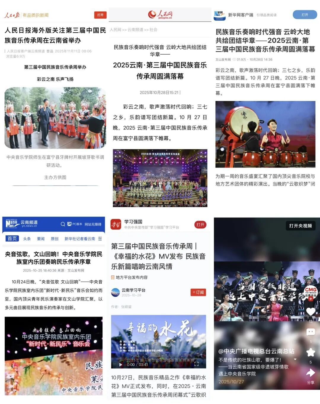 作为本届传承周重要传播主渠道的云南网、昆明市融媒体中心与文山州融媒体中心等当地主流媒体统筹20余家中央级、省级重要媒体联动宣传,形成权威传播主阵地:传承周期间有近400条融媒体新闻报道,既注重新闻时效性,又追求内容深度,形成了立体化的传播态势;多场音乐会的线上直播成为传播的一大亮点,总观看量超过400万次;在社交媒体平台,传承周相关话题也引发广泛关注,微博、短视频及原创歌曲MV内容发布使活动热度持续攀升。传承周新媒体传播总量突破1000万人次。与此同时,中央音乐学院“两微一端”与官网持续输出原创稿件、释放排练花絮等短视频,以更贴近青年用户的叙事方式讲述民族音乐故事。