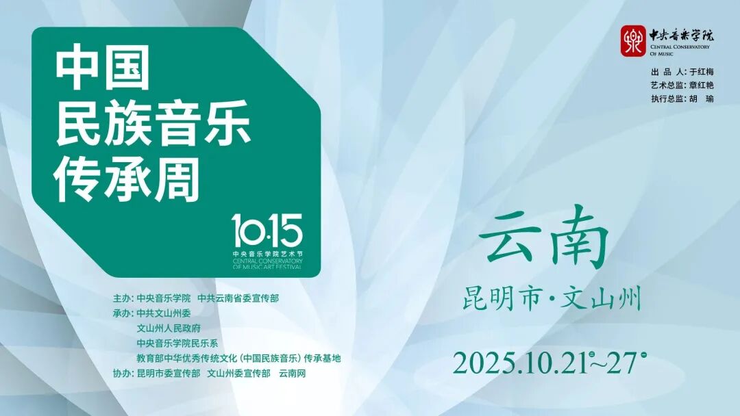 2025年10月21日至27日,由中央音乐学院与中共云南省委宣传部共同主办的“2025云南·第三届中国民族音乐传承周”(以下简称“传承周”)在昆明市、文山市、丘北县、富宁县4地圆满举办。作为中央音乐学院第七届“10·15”艺术节的重要板块,本届传承周以“立足传统、服务人民、聚焦时代、面向未来”为理念,依托云南这片多民族文化交汇的丰饶土壤,开展6场音乐会、7场“进校园”美育实践、3场“非遗”交流与民族音乐讲座、1场田野访谈等14场艺术活动,呈现出民族音乐在传统与现代、乡土与学院、生活与学术之间的多维回响。在新时代文化语境中,这不仅是一场艺术盛事,更是一份以文化自觉回应时代命题的“民族音乐当代答卷”。