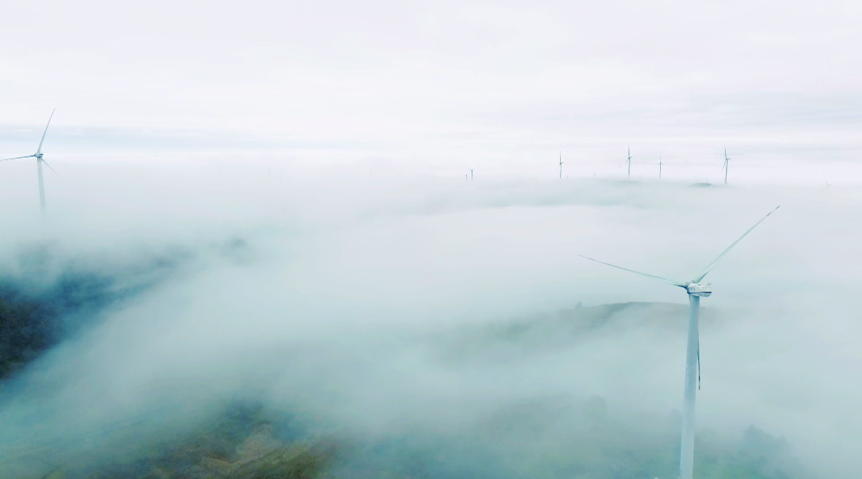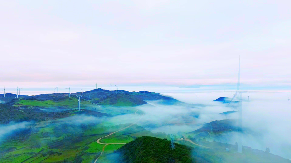 在航拍镜头里,只见云海时而舒展如静谧湖面,倒映着黛色的山影;时而翻涌如奔腾江河,裹挟着零星的风车旋转。