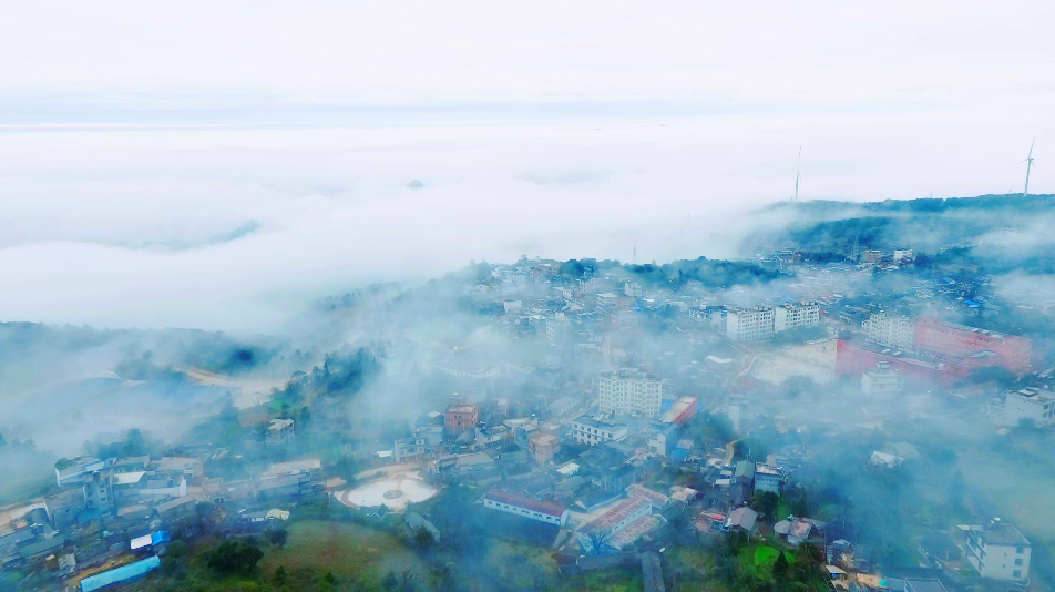 镜头缓缓平移,舍得乡集镇所在地宛如云上小镇,屋舍错落其间,在云海中时隐时现,袅袅炊烟与云气交融,分不清是人间烟火还是仙境氤氲。