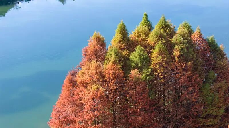 游客刘继丹分享道:“这里山水融为一体,感觉特别唯美,周末来打卡非常惬意。”游客李玲聪也赞叹:“落羽杉与湖面水天一色,太漂亮了,欢迎大家来打卡。”