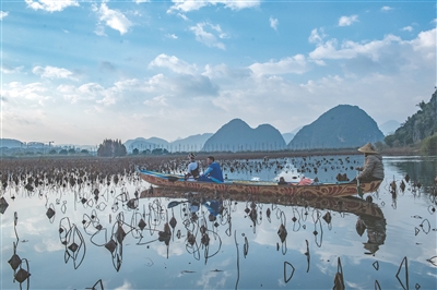 ①游客在丘北普者黑国家湿地公园内乘船游览。【熊平祥 摄】