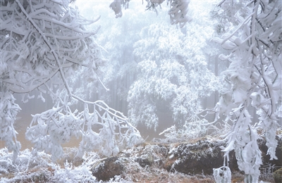 在丘北县舍得乡,冰凌雾凇银装素裹,如诗如画,美不胜收。满山的树枝上托着蓬松松的冰凌,一阵微风吹过,玉屑似的雪末随风飘落。枝头之上,凝结着一层厚厚的冰凌,晶莹剔透。