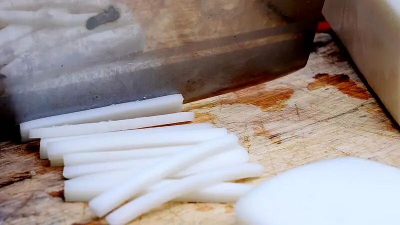 舂好的米粑被压实、定形,待微凉后,刀起丝现,匀细如箸,韧而不硬,这便是粑粑丝了。