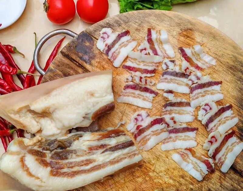 腊肉,是时间赠与的风物。丘北人家家户户檐下挂着的,不仅是肉,更是被盐、烟与时光腌制而成的乡情。取下一块,洗净切片,肌理紧实,红白相间,香气沉厚。搭配的豌豆尖,则一定要嫩,翠生生的一把,是冬日里难得的清新。