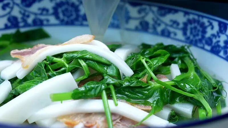 灶火重燃,腊肉下锅,“滋啦”一声,咸香顷刻满屋。另一边,粑粑丝如银缕入水,在滚汤中舒展开身子,烫到恰好的软糯弹牙。最后撒入豌豆尖,烫软即起,绿意点缀其间,清鲜解腻。盐、酱油、葱花、芫荽、酸菜依次落入碗中,再浇上热汤、铺上腊肉与粑粑丝——一碗热腾腾的腊肉粑粑丝,便成了。