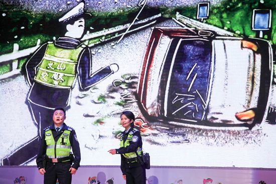 几位交警用幽默风趣又有教育意义的小品《安全出行》,给摩托车驾驶员上了一课:骑车一定要戴好安全头盔。当听到主持人介绍,和小品中的那位张大爷一样的交通安全劝导员,目前全州农村地区共有1187名,他们都是义务工作者,他们在田间地头、在乡间邻里用最朴实的语言把那些具有安全隐患的危险行为劝阻在源头时,掌声响彻现场。