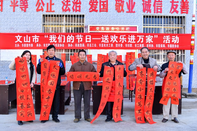 文网讯 2020年春节前夕,文山市文联组织市书法协会、摄影协会,进农村、企业、校园、社区、机关、边远山区,开展新时代文明实践“我们的中国梦——文化进万家”活动,送春联、送“福”字、送“全家福”、送科技等,通过活动,将新春的祝福提前送进千家万户。