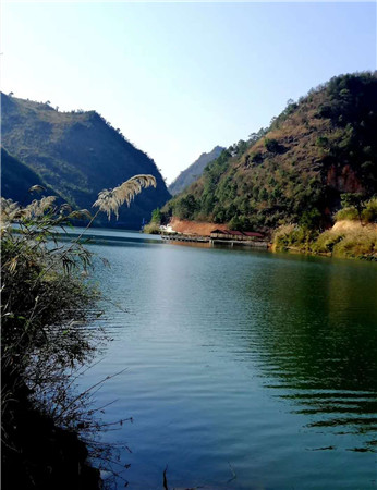 经历了惊险、刺激的玻璃栈道后来到山下后,只见江水碧绿,清澈透亮,一艘艘红色的画舫船在江面驶过,犁起洁白的浪花,绿水红船、蓝色的望夫桥,颜色非常艳丽,两岸的原始密林在金色的阳光下也显得格外的绿,这哪里是寒冬啊,江水犹如春水,山林如同金色的秋天,而山间的烂漫的野花又如同夏季,好一派生意盎然的大自然美景,大家立刻放松心情,感觉心旷神怡!