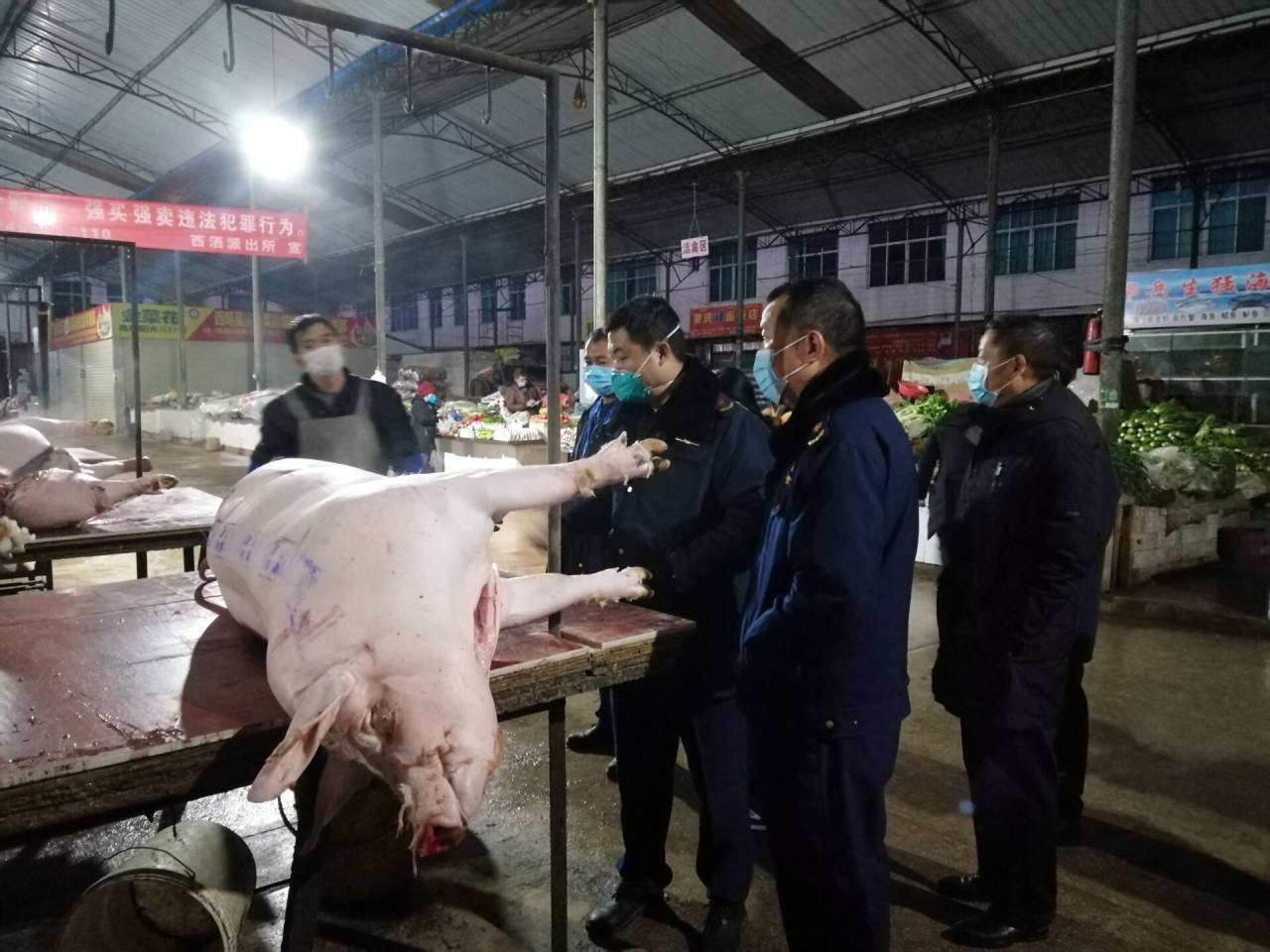 执法人员检查农贸市场内销售的鲜猪肉宣传