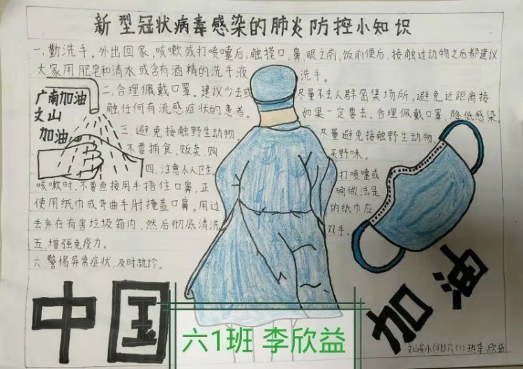文山虽然距离疫区较远,但我看到,大家已经积极行动起来,与武汉一道,共同做好疫情防工作。在我住的小区门口,悬挂着疫情防控的宣传语,张贴着疫情防控的通知。其它小区,设置了路障,对来往人员进行排查,发现武汉回文山人员,及时送往医院隔离救治。作为小学生的我们,现在虽然不能给国家出力,给武汉出力。但是,我们通过做手抄报,发宣传单等方式,提醒广大市民如何预防新型冠状肺炎病毒。
