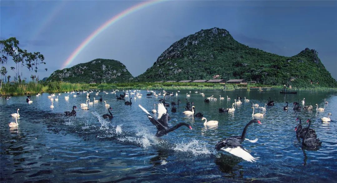 天鹅湖景点是普者黑景区内一个集喀斯特孤峰群、湖泊群、溶洞群、湿地生态群为主的生态型湖区。湖区内湿地生物极其丰富,仅候鸟就有大雁、天鹅、苍鹭、白鹭、钳嘴鹳等100多种。