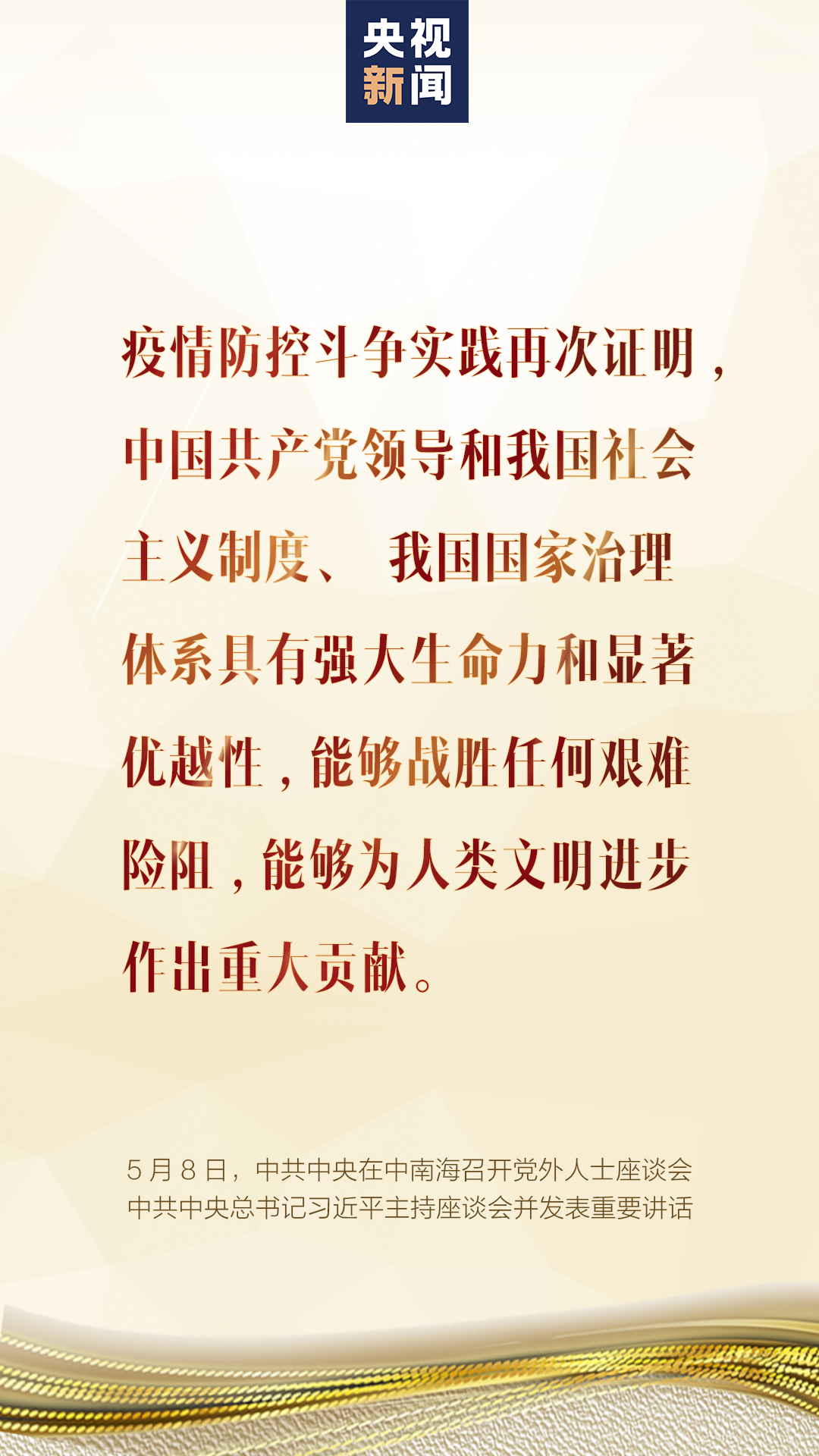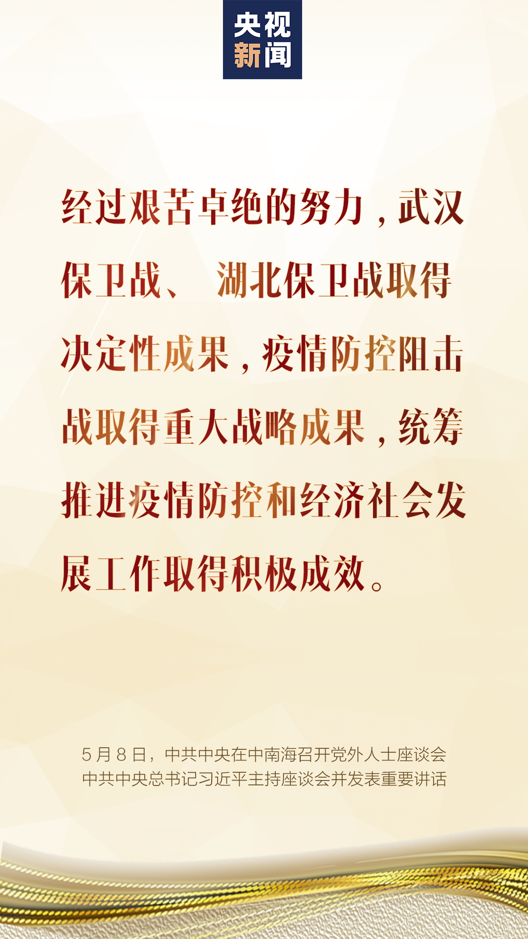 5月8日,中共中央在中南海召开党外人士座谈会,就新冠肺炎疫情防控工作听取各民主党派中央、全国工商联和无党派人士代表的意见和建议。中共中央总书记习近平主持座谈会并发表重要讲话。一、形势判断武汉保卫战、湖北保卫战取得决定性成果,疫情防控阻击战取得重大战略成果,统筹推进疫情防控和经济社会发展工作取得积极成效。当前,境外疫情暴发增长态势仍在持续,我国外防输入压力持续加大,国内疫情反弹的风险始终存在。