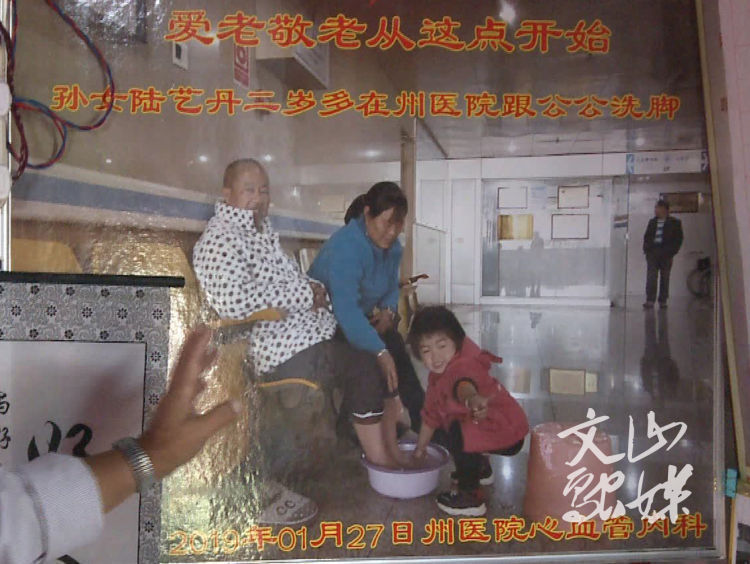 还有一张关于孝道的照片,特别让高晓发感动。2016年,他生病来文山州医院住院,晚上在走廊休息的时候,孙女给他洗脚。高晓发说,当时很感动,就拍下了这张照片,把这张照片放到展室,也是想教育下一代,使他们尊爱老人、孝敬老人。