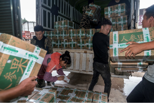 ▲ 8月20日,打包工人正在王雄的发货车间里装货,这个车间最高峰时有150人打包,每天能发出3万个人参果包裹。穆功/摄