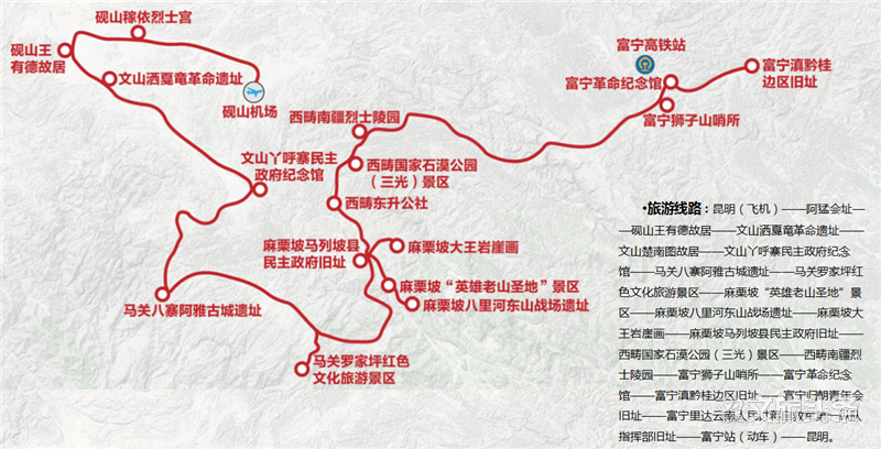 此条线路串起文山楚图南故居、麻栗坡“英雄老山圣地”景区、西畴国家石漠公园(三光)景区、富宁革命纪念馆等十几个景点。