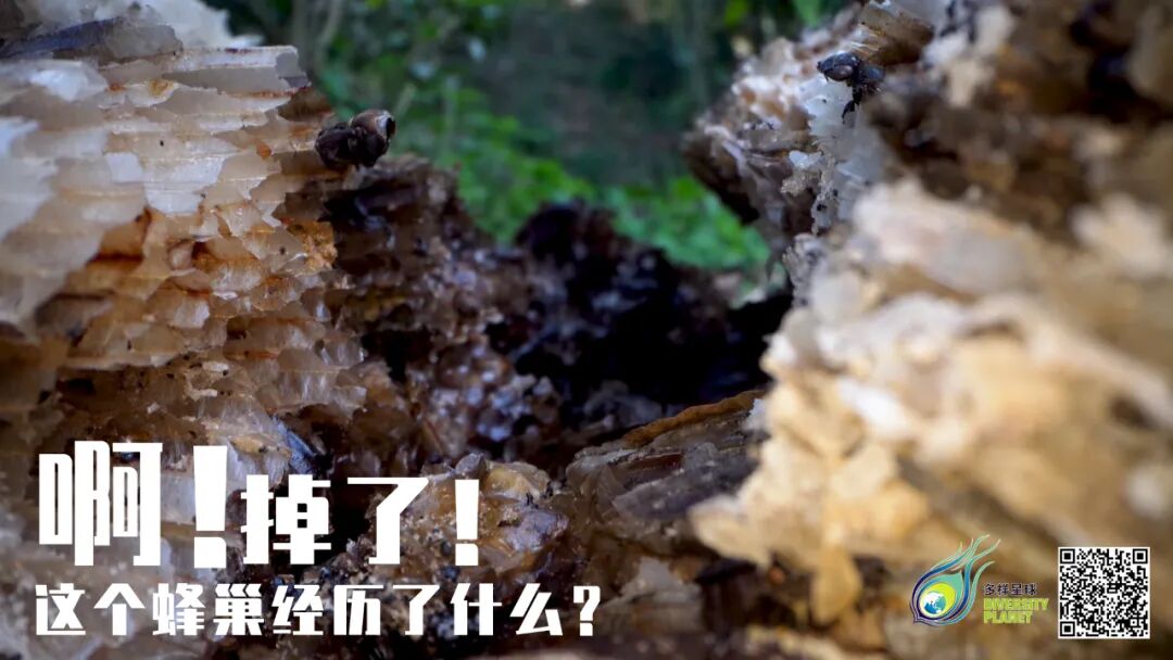 树底下有很多跌落的蜂巢,这是迁徙离去的蜂们废弃的。