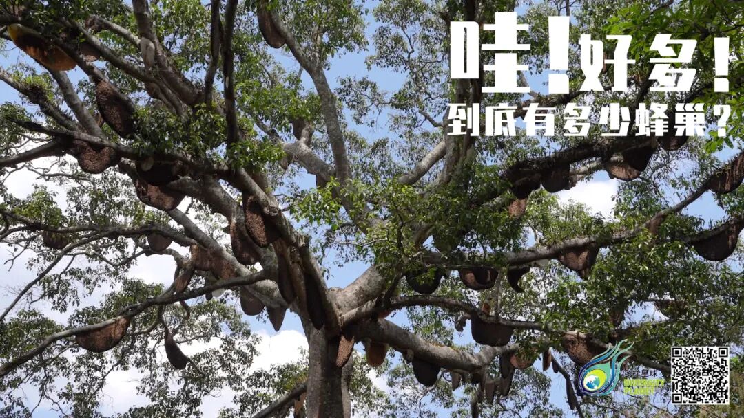 茁壮树干撑起宽大的树冠,枝叶参天犹如一把绿色巨伞,保护着枝丫上吊缀着的密密的大蜜蜂巢。愿这小小物种千百年来与人和谐相处的情景,一直延续下去。