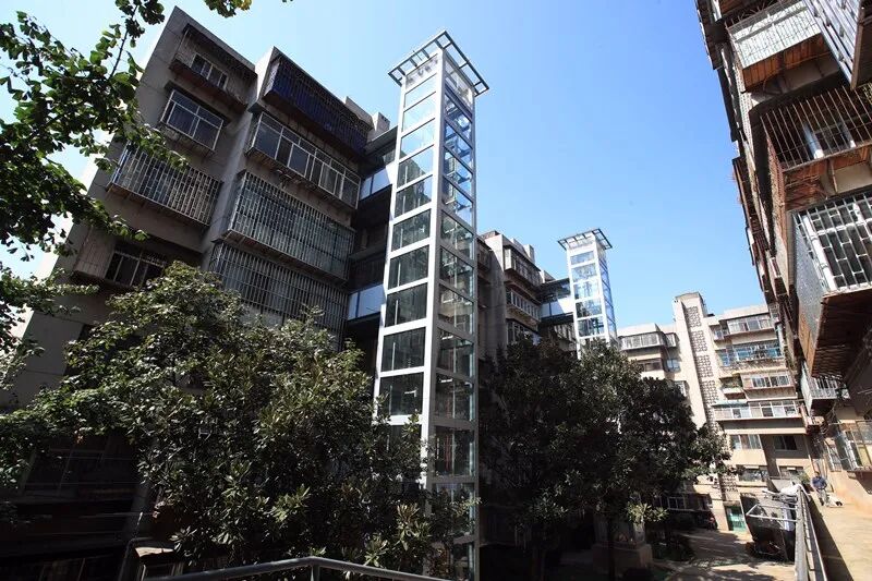 专门为老式社区里的居民楼设计、加装的电梯。