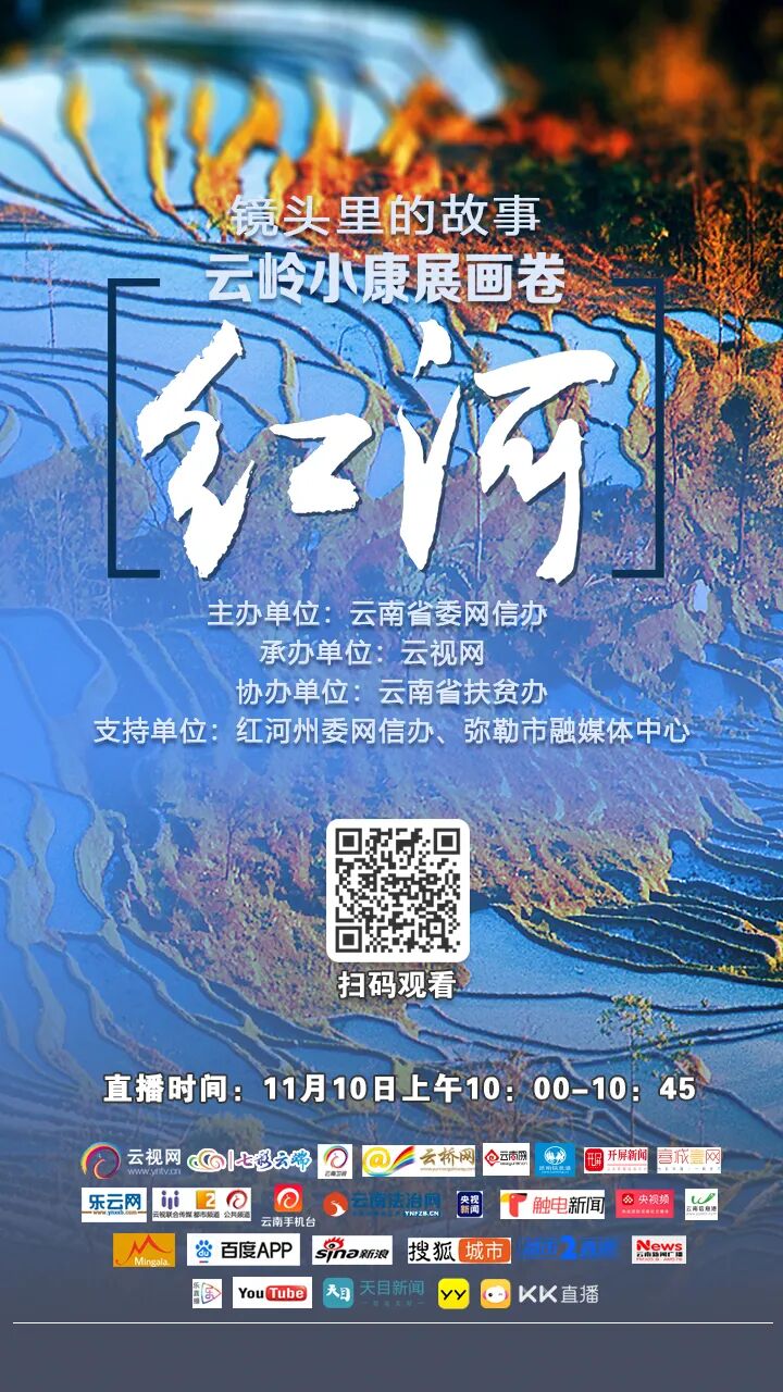 为记录云南全面建成小康社会的可喜成绩和感人故事,云南省委网信办指导、云南省扶贫办支持,云视网推出16场《镜头里的故事·云岭小康展画卷》大型主题系列直播,从2020年10月20日开始,每周二和周五上午10:00至10:30,对我省16个州市进行小康主题直播。2020年11月10日早上10:00-10:30,《镜头里的故事·云岭小康展画卷》大型主题系列直播将走进红河哈尼族彝族自治州弥勒市弥阳镇章保社区。