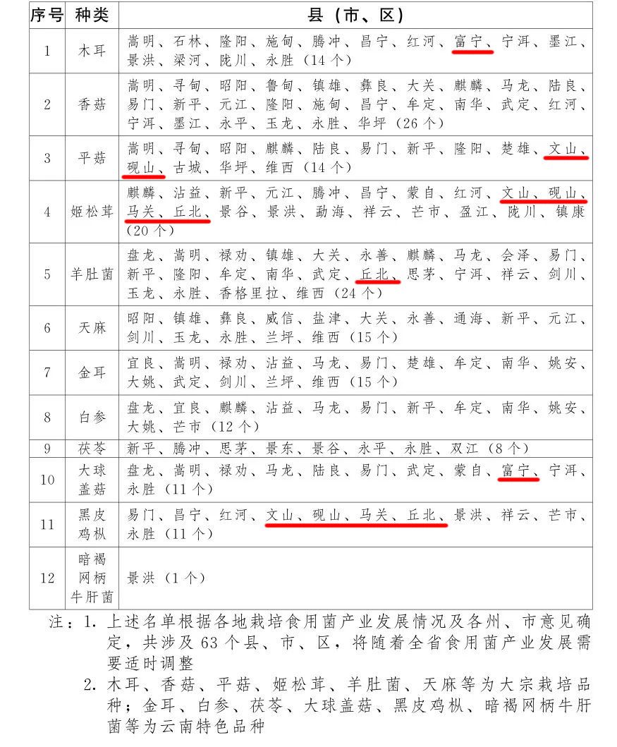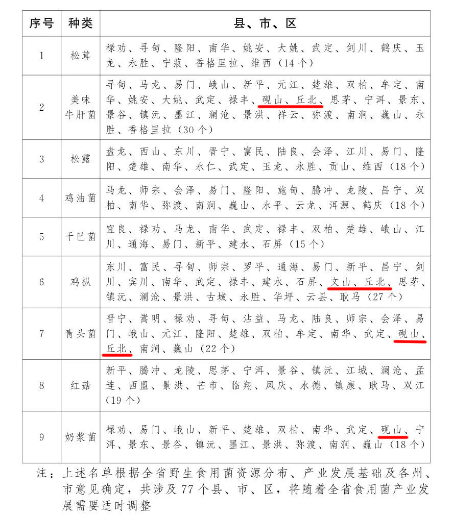 野生食用菌方面,重点围绕松茸、美味牛肝菌、松露、鸡油菌、干巴菌、鸡枞、青头菌、红菇、奶浆菌等9种野生食用菌打造一批保育及供应基地县(详见附件1)。