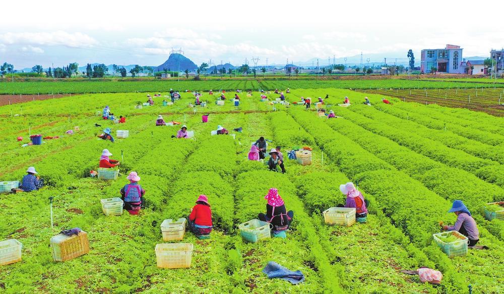 工人在砚山县平远蔬菜基地采收芹菜。 杨道能 摄