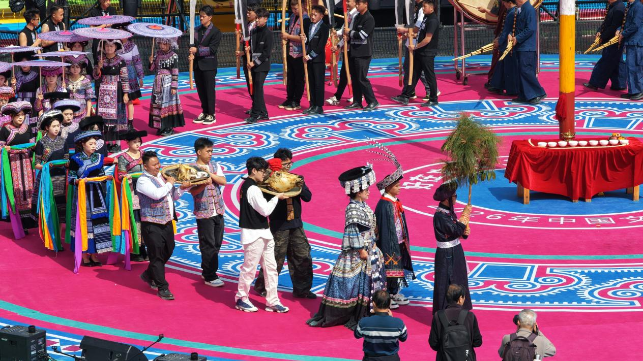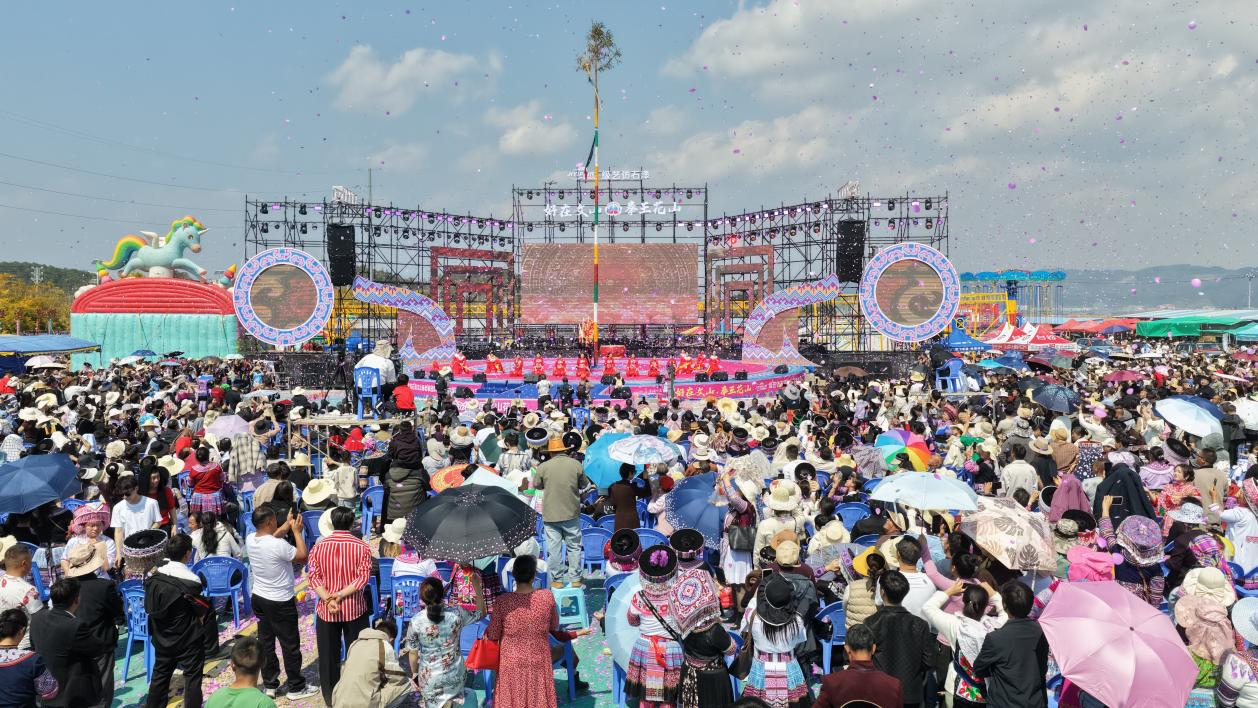 正月初二,年味从城区蔓延至山野。熊朝忠拳王花山场上,庄严的祭杆仪式拉开帷幕。苗族长老口诵祈福古语,各族同胞手牵手、肩并肩,围绕花杆载歌载舞。花杆下,汉族、壮族、彝族、苗族兄弟姐妹的笑脸交相辉映,绘就“像石榴籽一样紧紧抱在一起”的温馨画面。“走索吹笙”绝技惊险登场,表演者在绳索上稳步前行、芦笙悠扬,引得掌声雷动;斗牛场上,两头健牛激烈角逐,呐喊助威声一浪高过一浪。