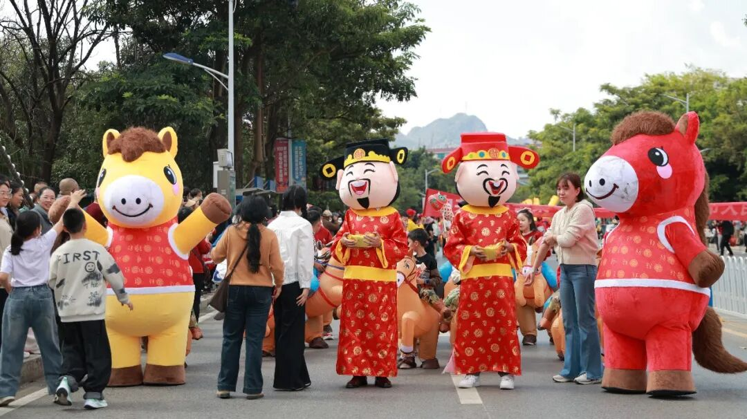 正月初一下午,伴随着欢快的锣鼓声,“骐骥闹春 欢乐文山”春节巡游在琵琶岛公园热闹启程。憨态可掬的财神爷和小马吉祥物打头阵,舞龙舞狮队紧随其后,金龙腾跃、雄狮起舞,瞬间点燃全城热情。