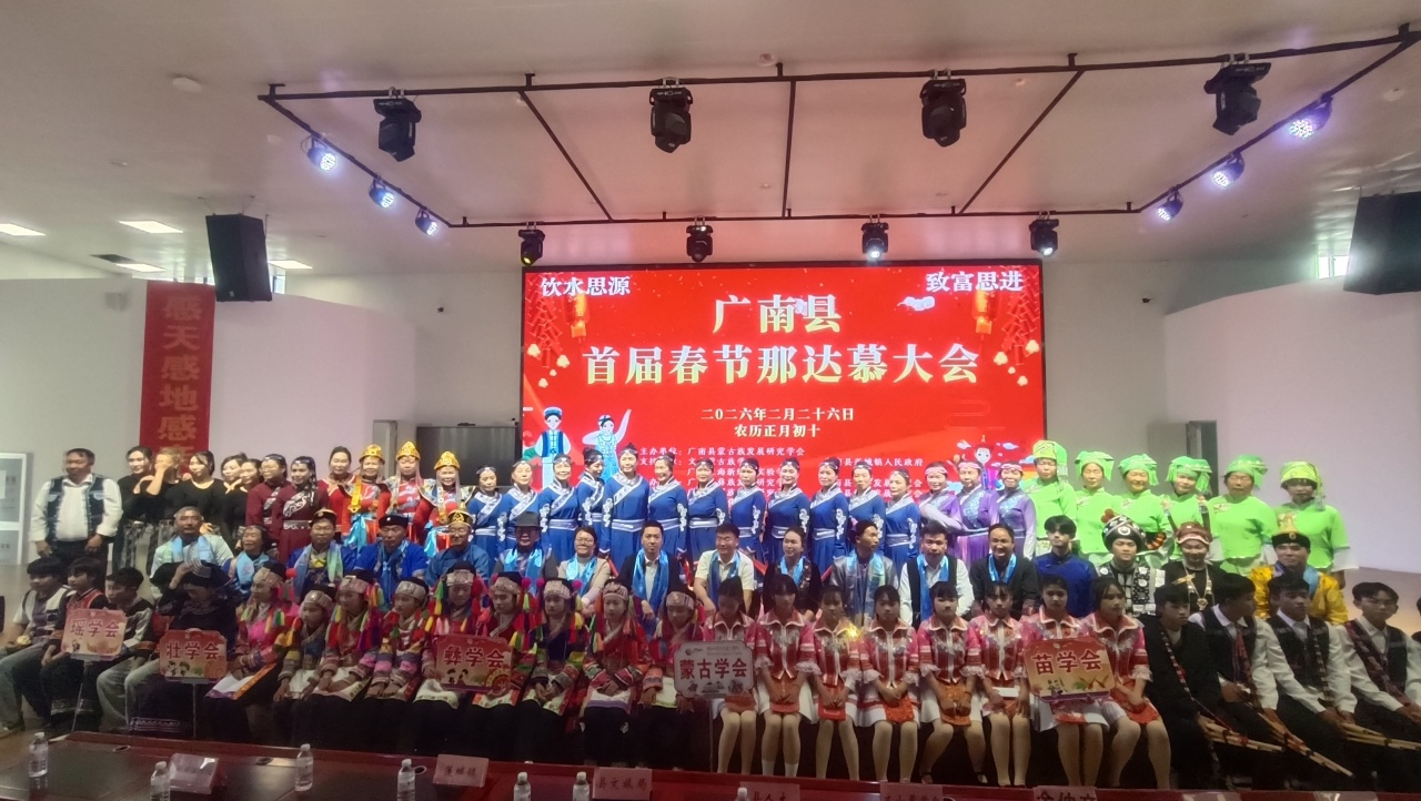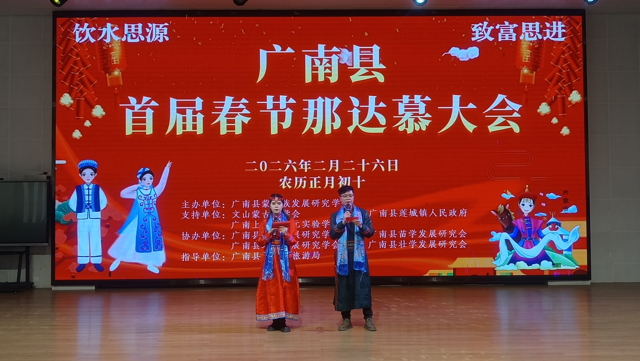 2月26日下午,广南县以“赶团结街,过幸福年”为主题的首届蒙古族那达慕大会在广南县新纪元学校阶梯教室举行。此次那达慕大会不仅是一场民族文化的绚丽展示,更是各民族交往交流交融的宝贵契机,吸引了众多学会、乡镇代表及各族同胞踊跃参与,共同编织了一幅民族团结的和谐画卷。