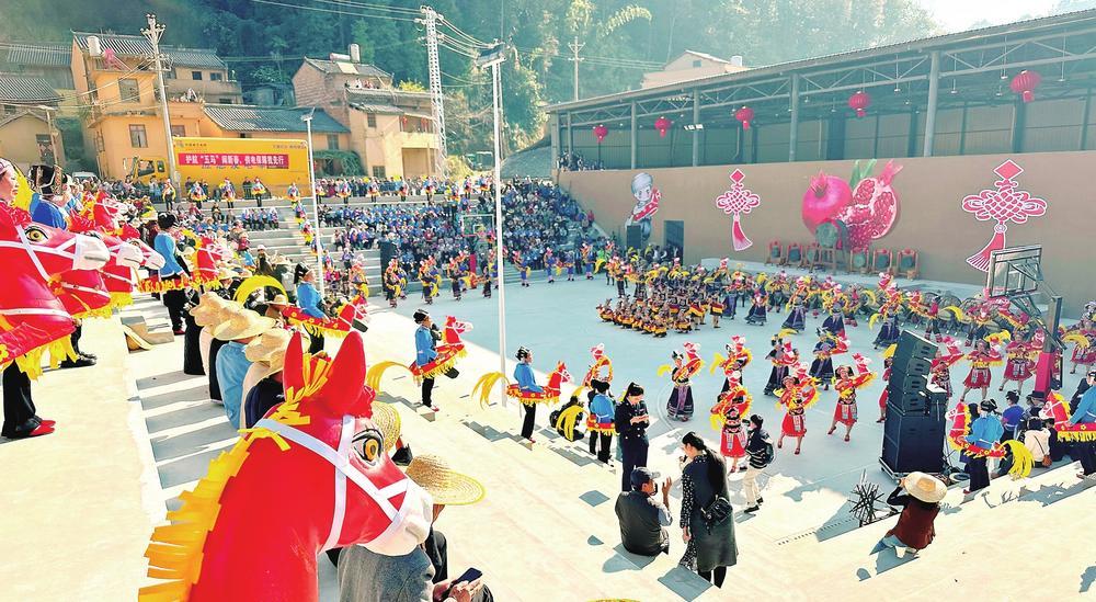 春节前,马关县马洒村“五马”闹新春民俗活动火热上演,百余名群众身披彩纸马翩翩起舞。 张文峰 摄