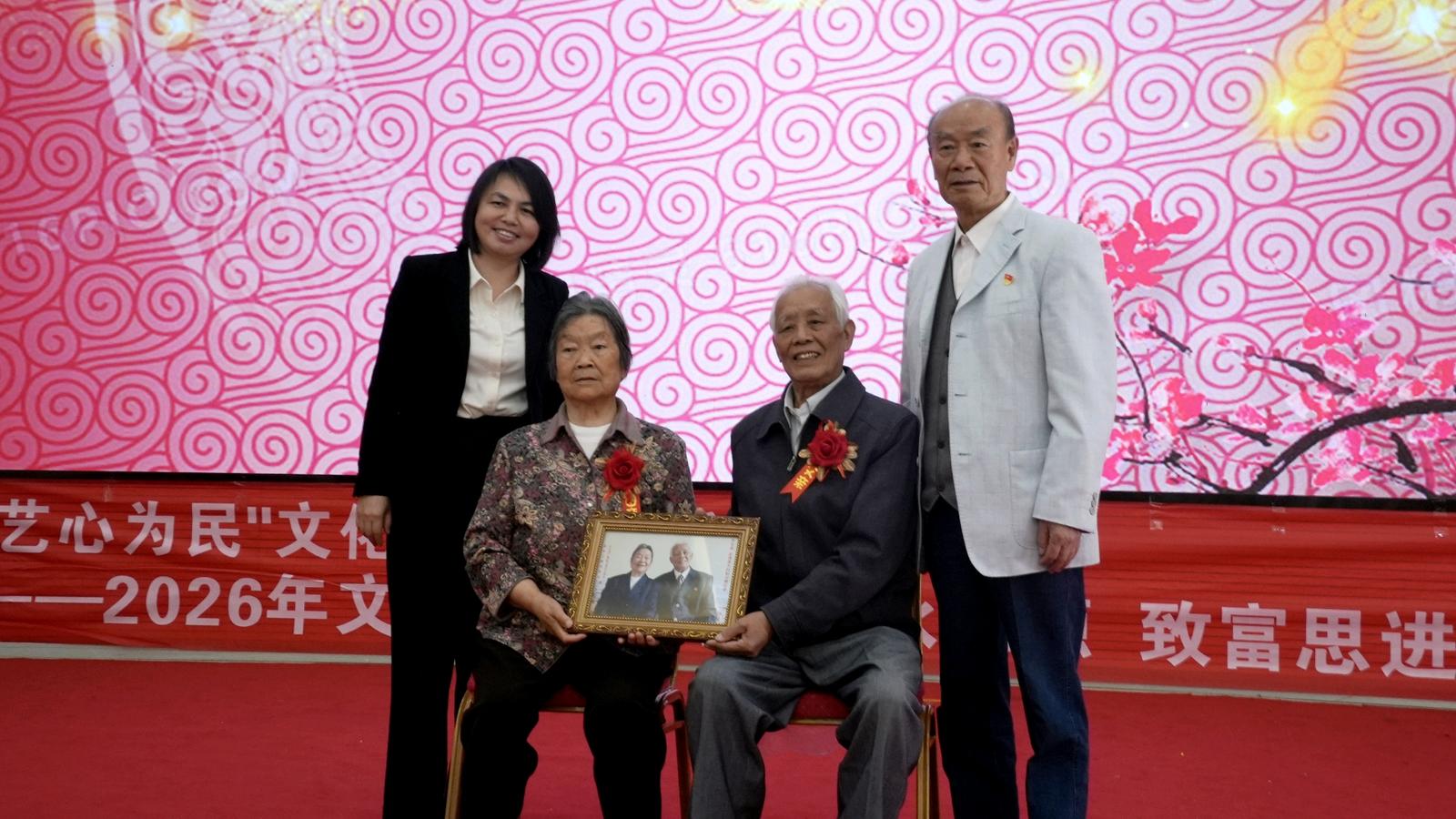 活动现场温情满满,协会为韦光荣夫妇佩戴鲜花并赠送钻石婚纪念照。同时,对年度先进会员进行表彰,颁发荣誉证书和奖金,激励大家继续发挥余热、奉献力量。