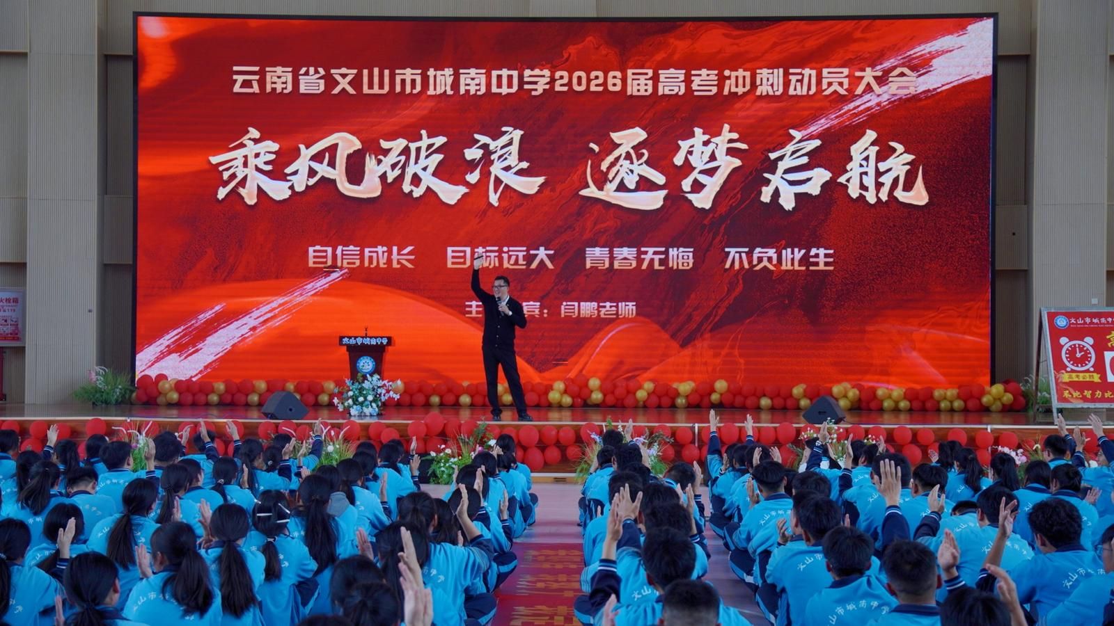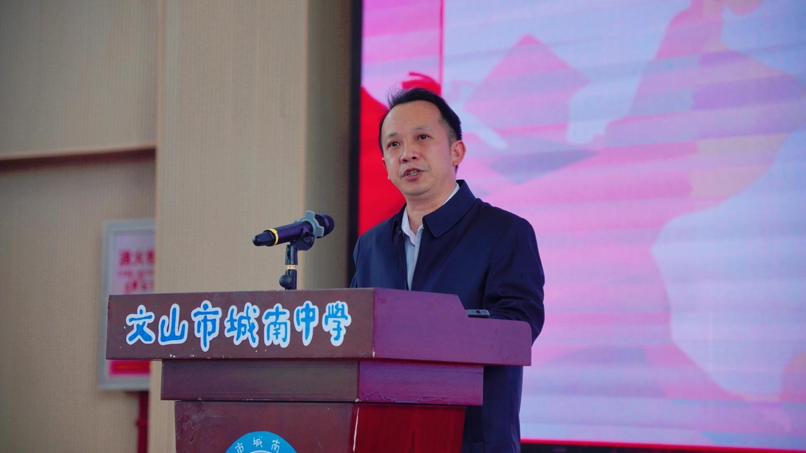誓师大会在雄壮的国歌声中拉开序幕。文山市城南中学校长农贵踊登台致辞,以饱含期许的话语寄语高三学子。他结合高考冲刺的关键节点,既肯定了学子们过往的辛勤付出,也为大家指明了科学备考的方向,送上了学校最真挚的祝福与厚望,鼓励同学们以坚定的信念、顽强的毅力迎接挑战。