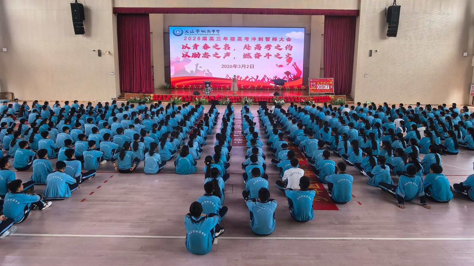 文网讯 为激发高三学子备考热情,凝聚冲刺力量,3月2日,文山市城南中学举行了2026届高三年级高考冲刺誓师大会。全校高三师生以昂扬姿态集结,共同吹响决胜高考的冲锋号角。