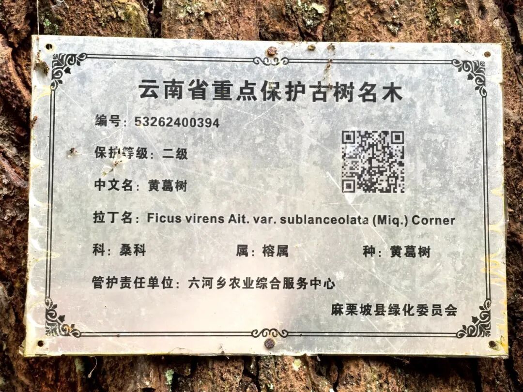 标识牌显示,这棵黄葛树属于桑科榕属,已被列为云南省二级重点保护古树名木。黄葛树,又称绿黄葛树,是西南地区常见的乡土树种,以其顽强的生命力和独特的板根景观著称。这棵树历经岁月雕琢,树干粗壮,树皮呈深褐色,表面布满岁月留下的沟壑;树冠如巨伞,枝叶繁茂,浓荫蔽日,炎炎夏日为村民提供一方清凉之所。