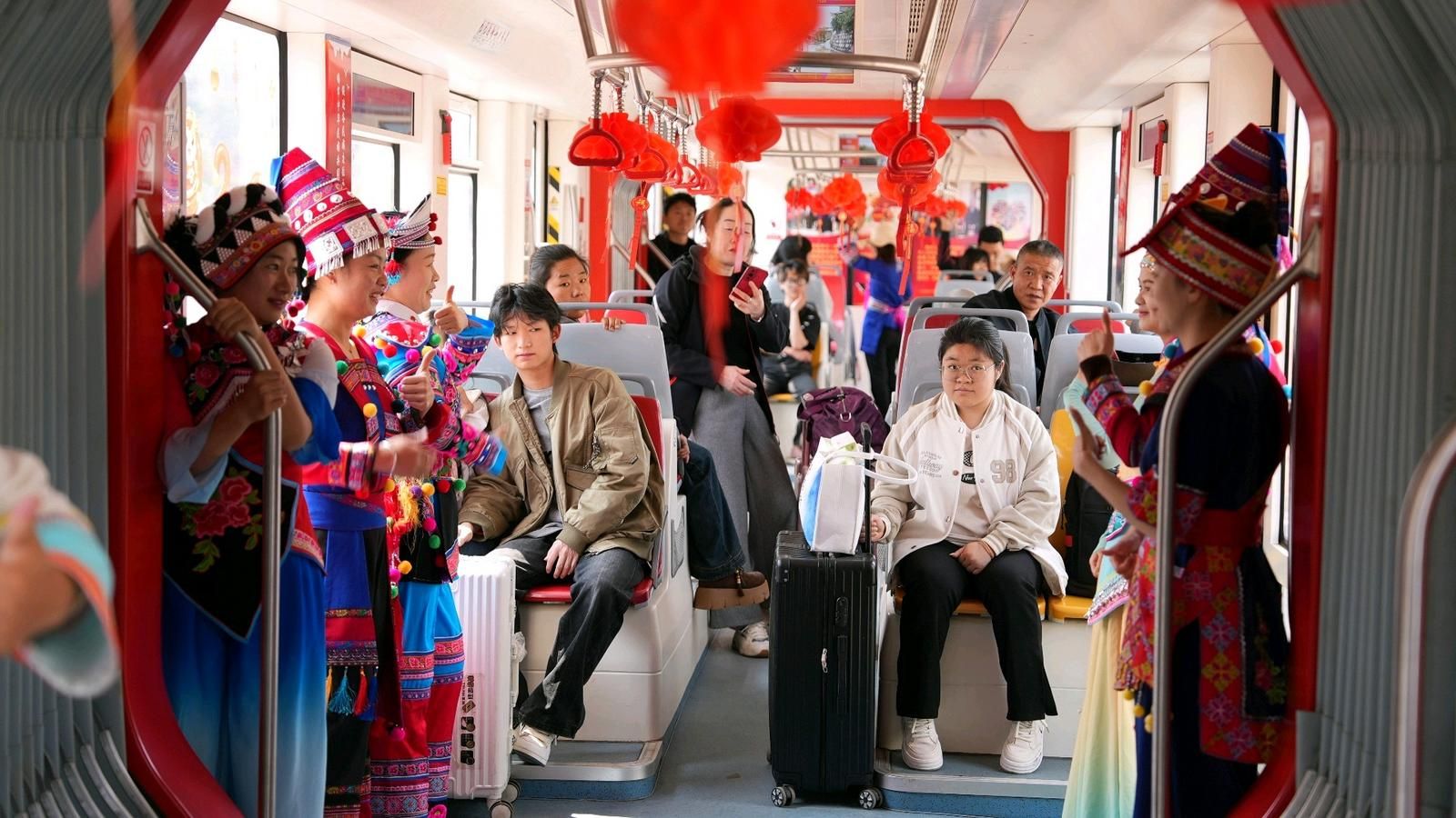 在普者黑有轨电车上,满车厢的红灯笼将节日氛围感拉满。吴哲芳 摄