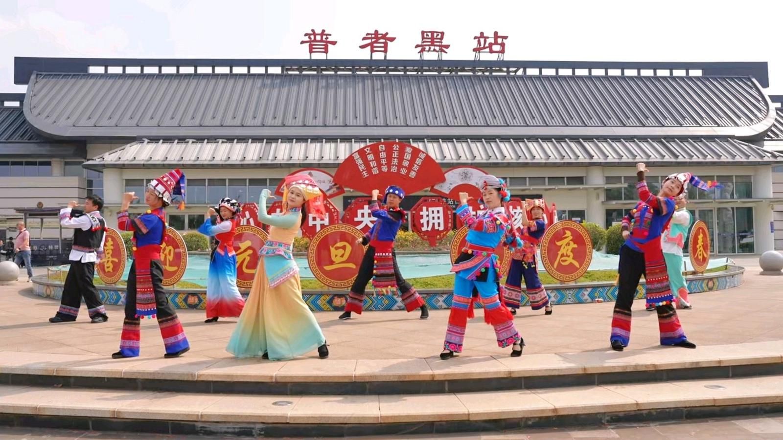 在普者黑高铁站广场上,身着多彩民族服饰的表演者们载歌载舞欢庆元宵节。吴哲芳 摄