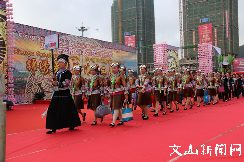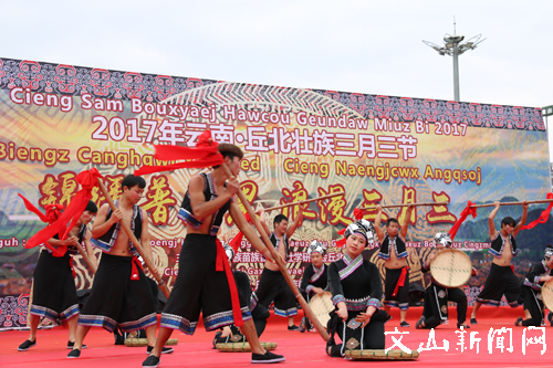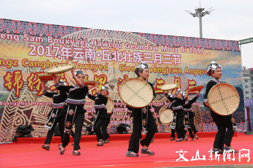 文网讯 锦绣普者黑,浪漫三月三。4月1日上午,来自四面八方的壮族同胞齐聚丘北县城椒莲广场,庆祝2017年云南·丘北壮族三月三节,一同沉醉在歌的海洋、舞的世界里。