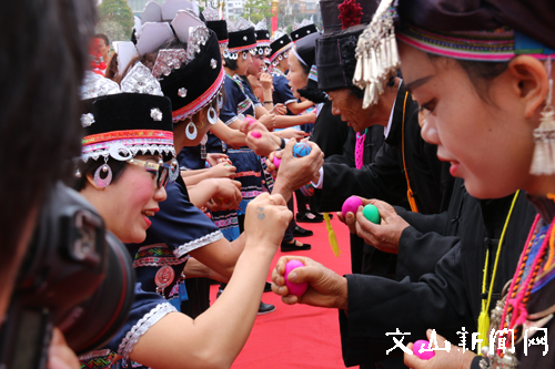 当天上午,来自全县各乡镇的文艺代表队整齐列队通过迎宾门,身着盛装的壮家少女端着酒杯,唱着敬酒歌,热情迎接每一位远道而来的客人。伴随着鼓声,大家手牵手一起跳着竹竿舞,迎宾的礼仪还会给客人戴上代表“鸿运当头”的红鸡蛋,敬上一杯壮家米酒。随后,隆重的开幕式演出随即开始,《壮乡三月三》《捉蝴蝶》《呗侬》《水竹花伞》等歌舞迷醉了游客,《古壮文书法表演》、非遗展演《火草情》则让大家感受到了壮家浓郁的民族风情。而碰鸡蛋比赛,则将现场观众的热情点燃,这项传统的民俗活动引得观众阵阵较好。