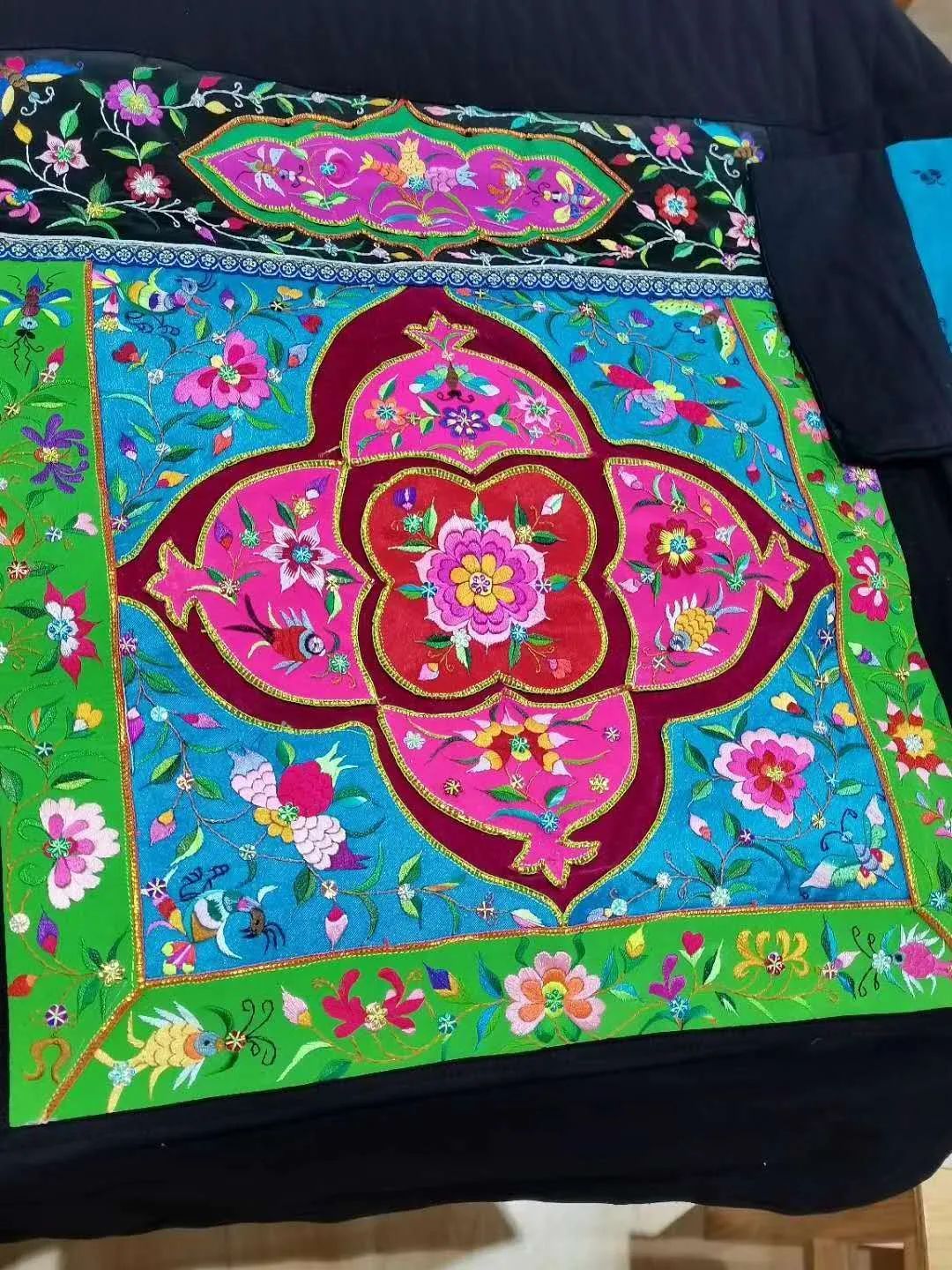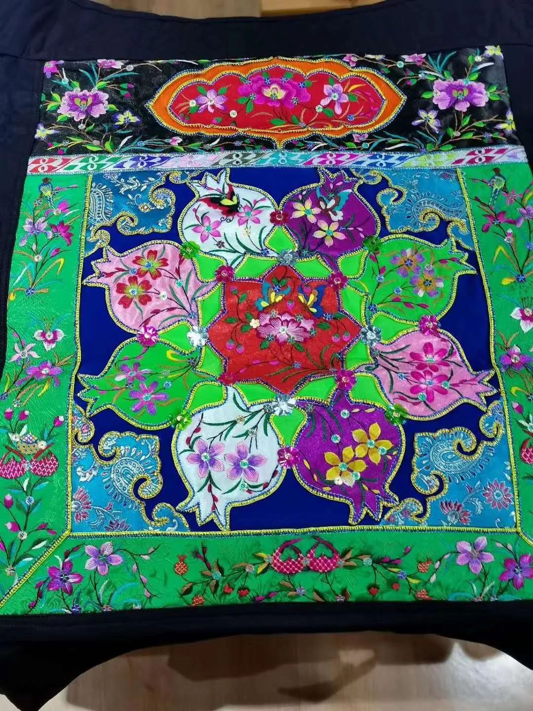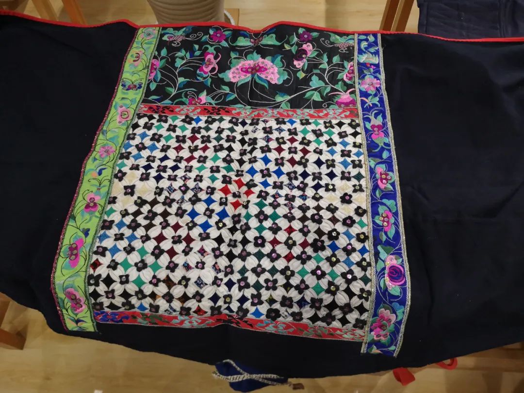 壮族背带纹样丰富、图案精美。制作方式主要有拼接和刺绣两种,拼接是用小布块折叠成各种形状,直接拼接缝制在背带上,较为常见的图纹有拼花、方格等。