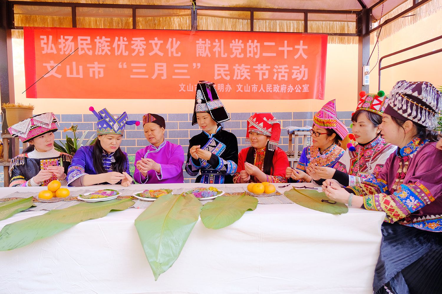 4月2日,在壮族的“三月三”到来之际,文山市文明办,文山市人民政府办公室在云南博雅民族文化传承中心举办了“弘扬民族优秀文化 献礼党的二十大”文明实践活动。少数民族干部职工身着节日盛装,聚在一起品美食、展示民族服饰,并在壮族阿姨的精心指导下,学习编织盘扣,体验节日里的民族文化和壮族妇女过节的情景。用特殊的方式度过了一个有意义的“三月三”。