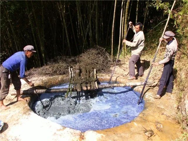 把鲜靛棵投放在浸靛窖中用水浸泡,充分发酵至池水呈蓝色,发出靛汁馨香时,用木耙和滤靛箩将靛棵捞出(称滤汁),再撒适量生石灰粉进靛窖内(称典汁),用木棒猛力搅动,直到池水浮起大量绿色泡沫,然后将靛窖封盖严实,避免日晒雨淋。两天后,石灰与蓝靛水化合沉淀,把池内上端的废水往外排,将留在池底的靛汁(半固态)排入下方存靛池内晾3-5天,使水分蒸发成为膏状,再铲入靛缸搬回家中存放备用。使用时,只需取适量靛膏和水放入染缸中,加入适量食用酒即可。