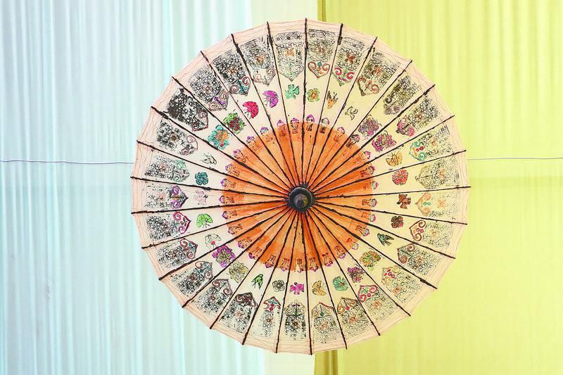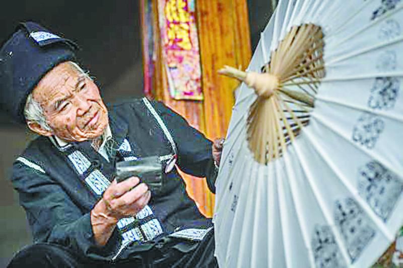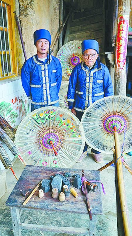 丘北县壮族的水竹花伞,因选用本地优质的水竹作为原材料,做成伞架、伞骨、伞柄、伞托,再在伞面上用木刻印章印上各色不同含义的花纹而得名。