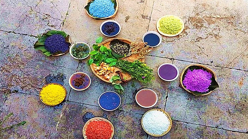 用野生植物提取色素浸泡的各色糯米