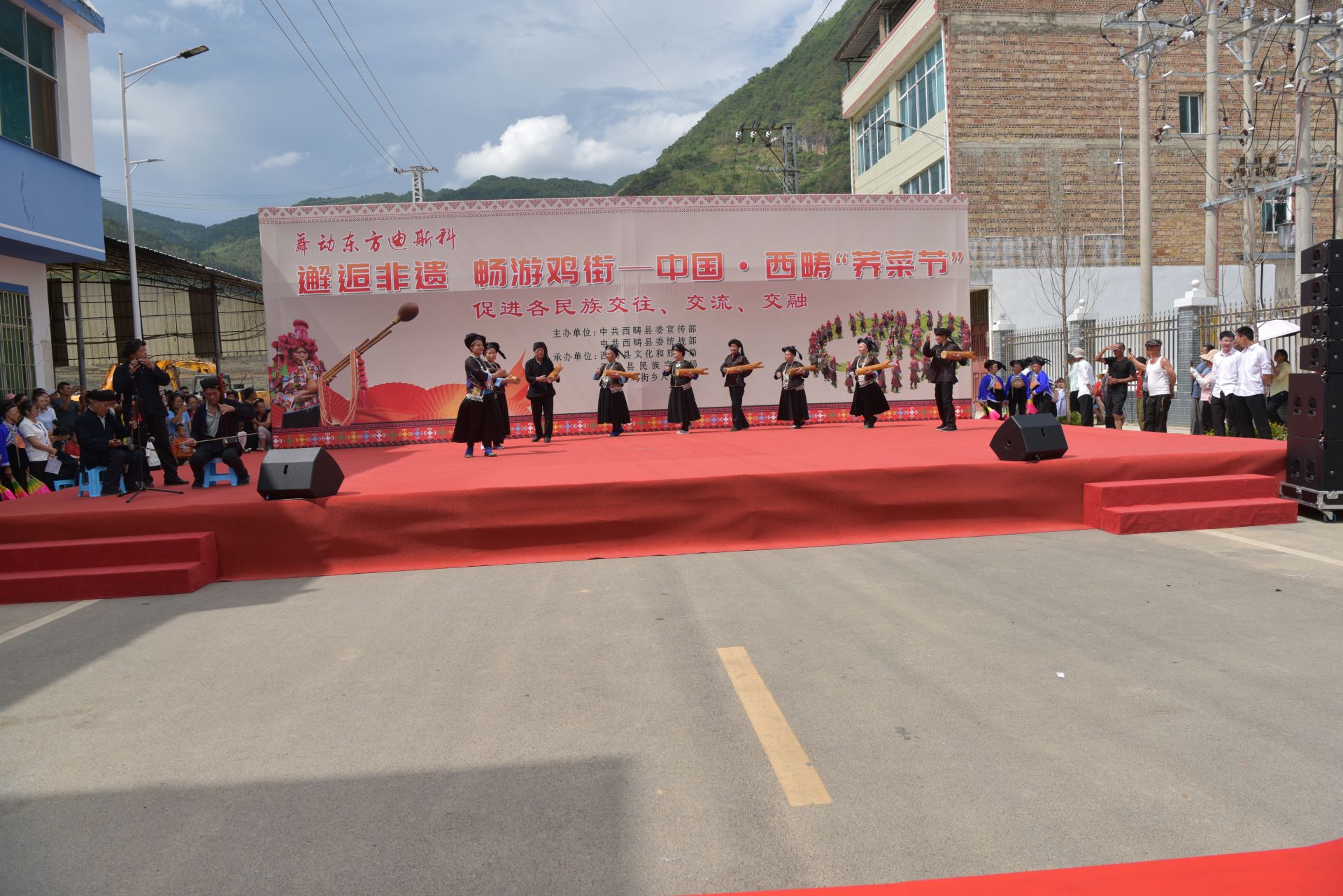 当天,还邀请了周边各个民族,在鸡街乡小集镇举行非遗展演。引来不少游客前来观看,大家一起跳起被誉为“东方迪斯科”的彝族葫芦笙舞,古老悠扬的旋律在现场回荡。随后,渔鼓说唱、童谣《水母鸡》等各民族的非遗节目轮番上阵,为彝族荞菜节助兴。现场高潮迭起,掌声、欢呼声一浪高过一浪。