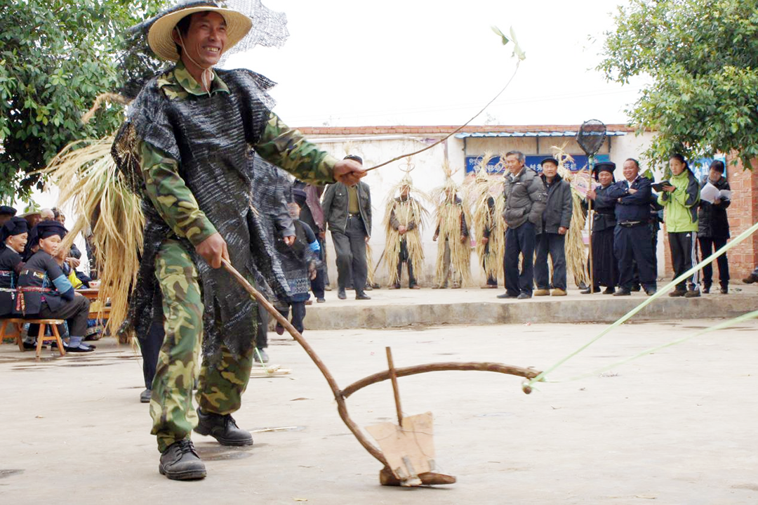 伴随着铿锵有力的锣鼓声,一个个全身裹满稻草的“草人”开始了表演,他们时而模拟犁田耙地,时而模拟收割稻谷,舞蹈动作充满原始色彩和古朴气息……