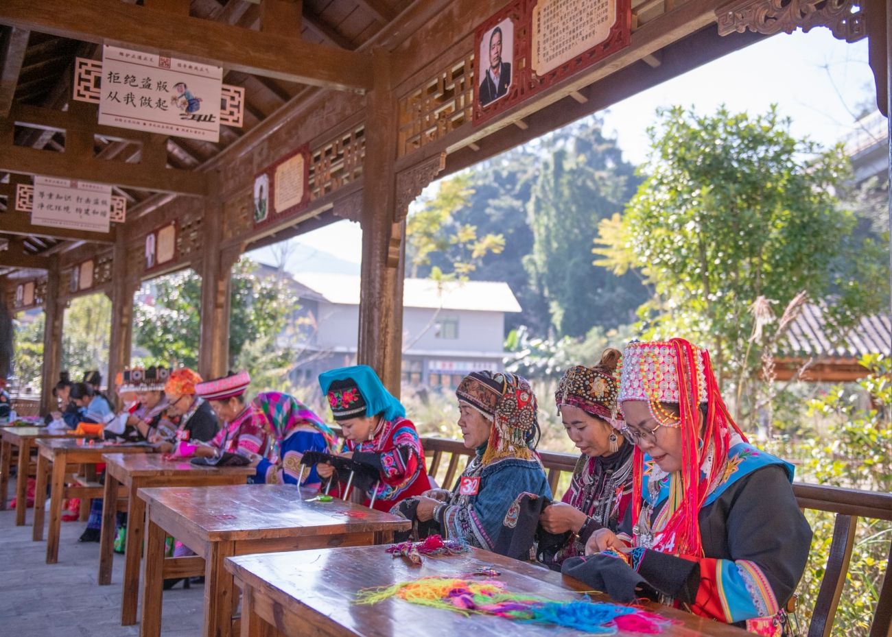 在“锦绣文山·巧手织梦”刺绣活动现场,绣娘们忙着理线、穿针(11月21日摄)。新华网发(熊平祥 摄)