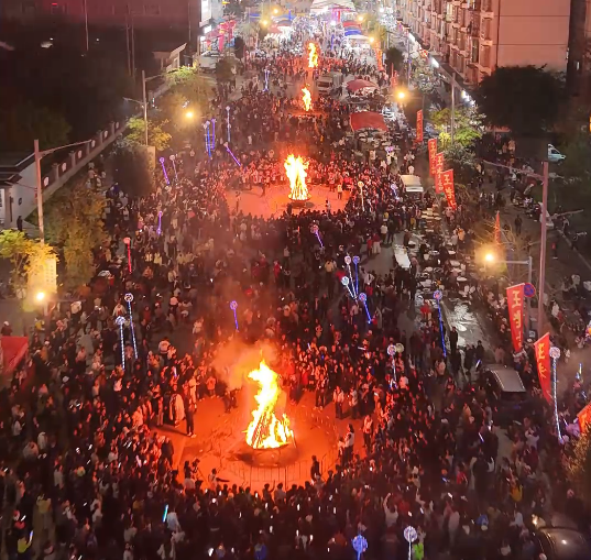 活动特设“五谷圣火”点火仪式,承载彝族人民对丰收与美好生活的向往,象征各民族同心共创未来的信念。21点,嘉宾手持火把点燃“圣火”,火光照亮夜空与各族群众的笑脸。点火仪式后,云南民族歌舞打跳开启。欢快音乐中,大家手拉手、肩并肩围着篝火起舞,不同民族服饰交相辉映,歌声、笑声、音乐声交织成民族团结的欢乐乐章,大家用最真挚的热情、最欢快的舞姿,共庆彝年、共话深情。