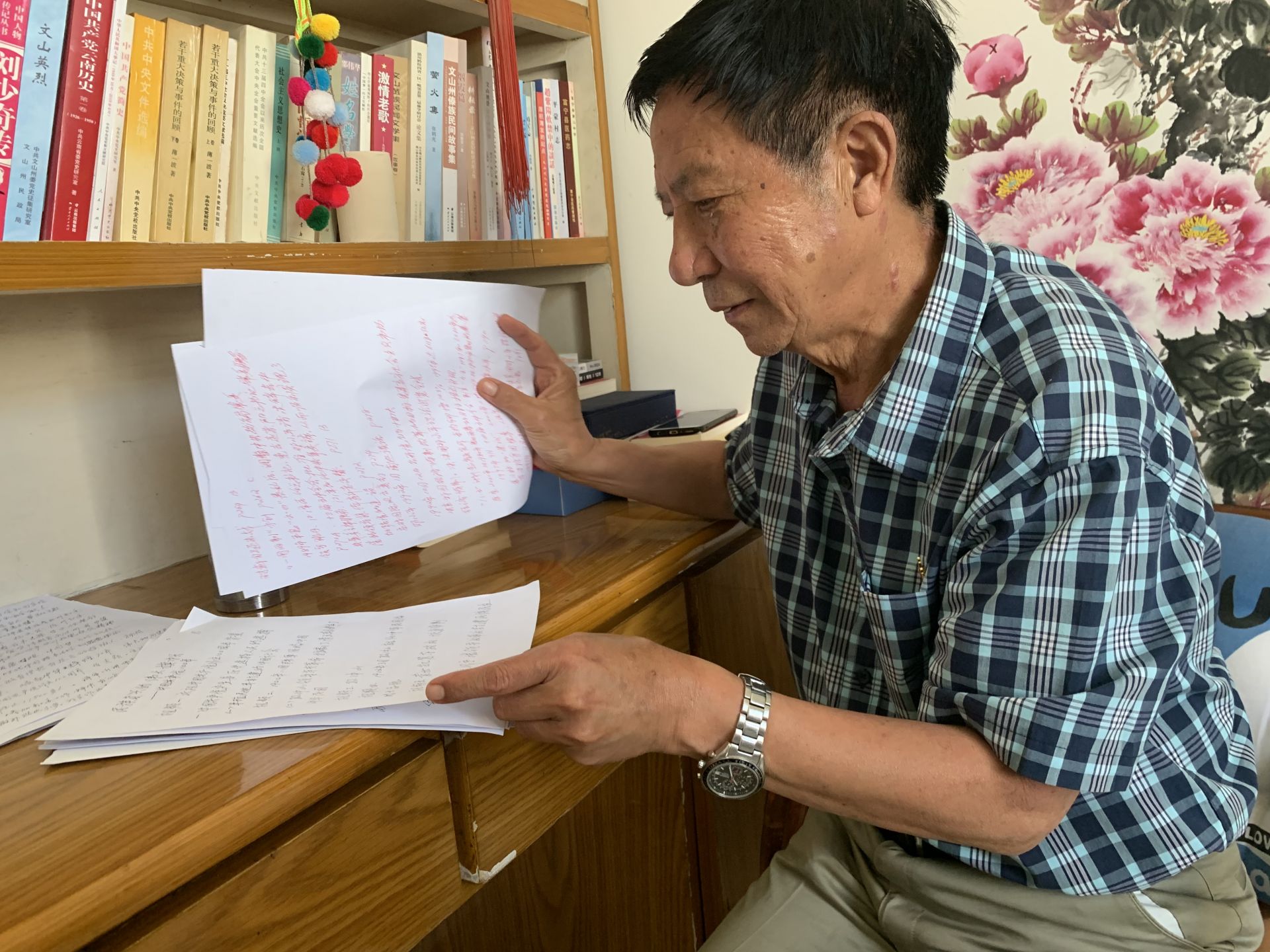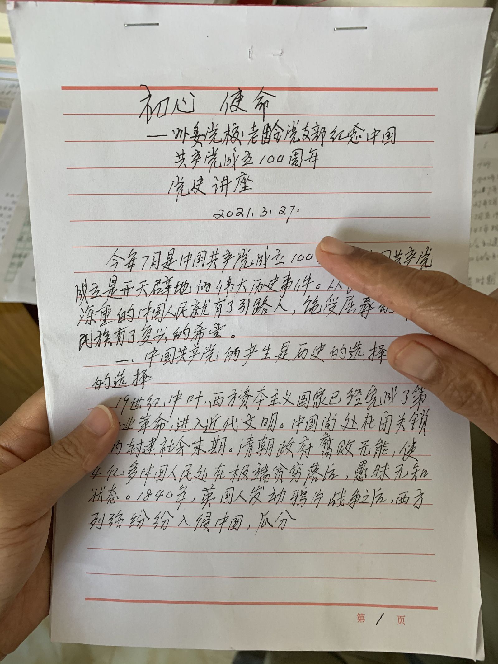 走进他的书房可以看到,他的书架上摆满了古今中外各科各界的书籍,书桌上摆满了他手写的近期需要宣讲的提纲和草稿。谷老说,随着时代进步,现在宣讲需要用课件,他年纪大了,电脑操作不熟练,但是他会事先将所有需要宣讲的内容准备好,包括每页PPT需要出现的文字、图片、视频等,他都会一一按顺序标注好,然后再让人帮他做成课件。
